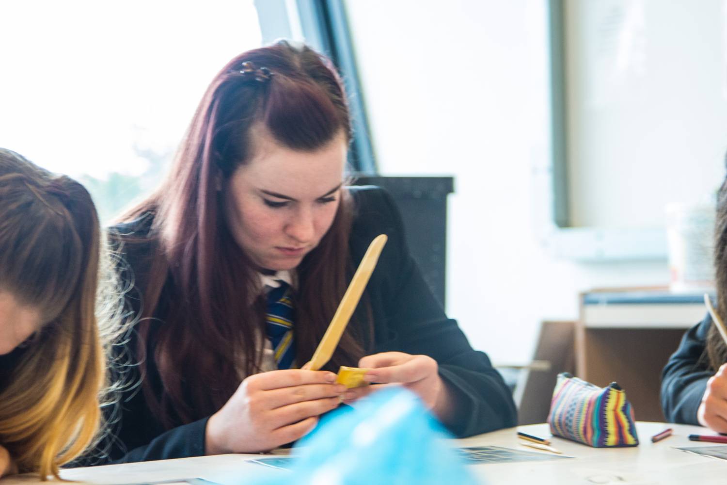 Maddie Ball, Ellie Ecclestone, Esmee Holt, Alex Reeve, Hannah Hannon and Charlotte Fone all took part in the workshop session, where they learned a new technique of making beeswax stamps of images they had sketched of soldiers. The stamps were then used to make plaster casts and then the images were imprinted on to squares of paper porcelain. Some pupils put lettering on their work, many chose to put the age of the solider which highlighted just how young some of the casualties of the war were.