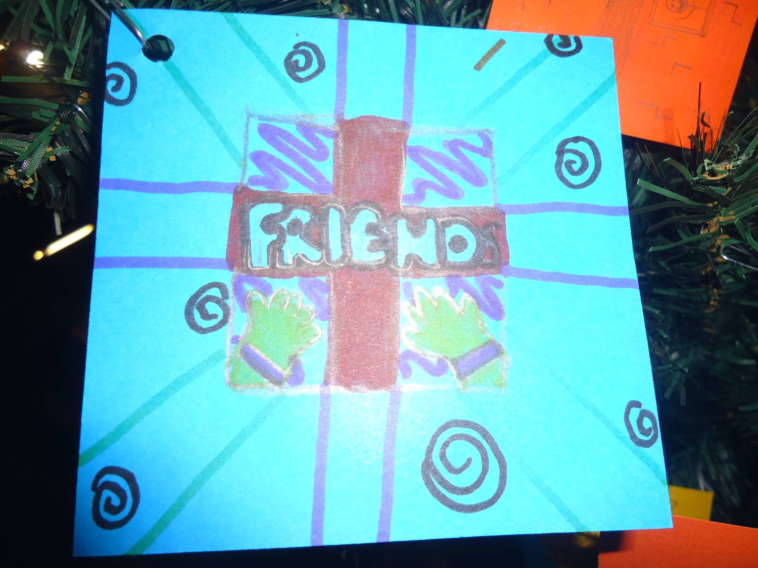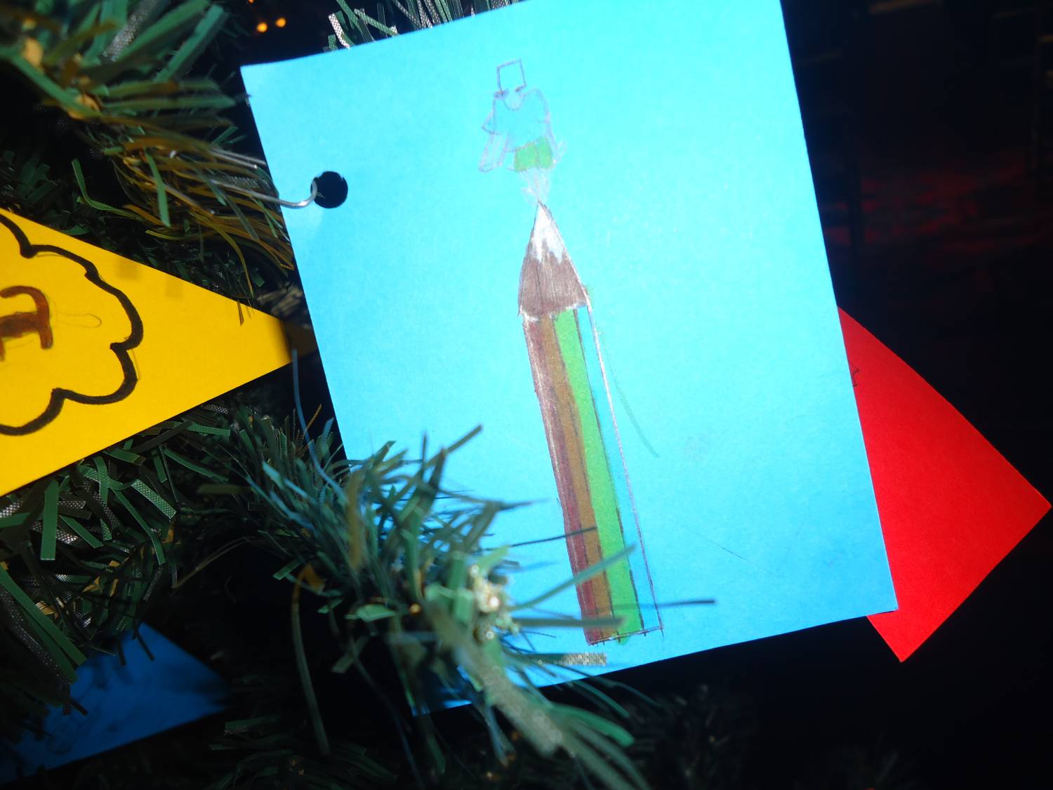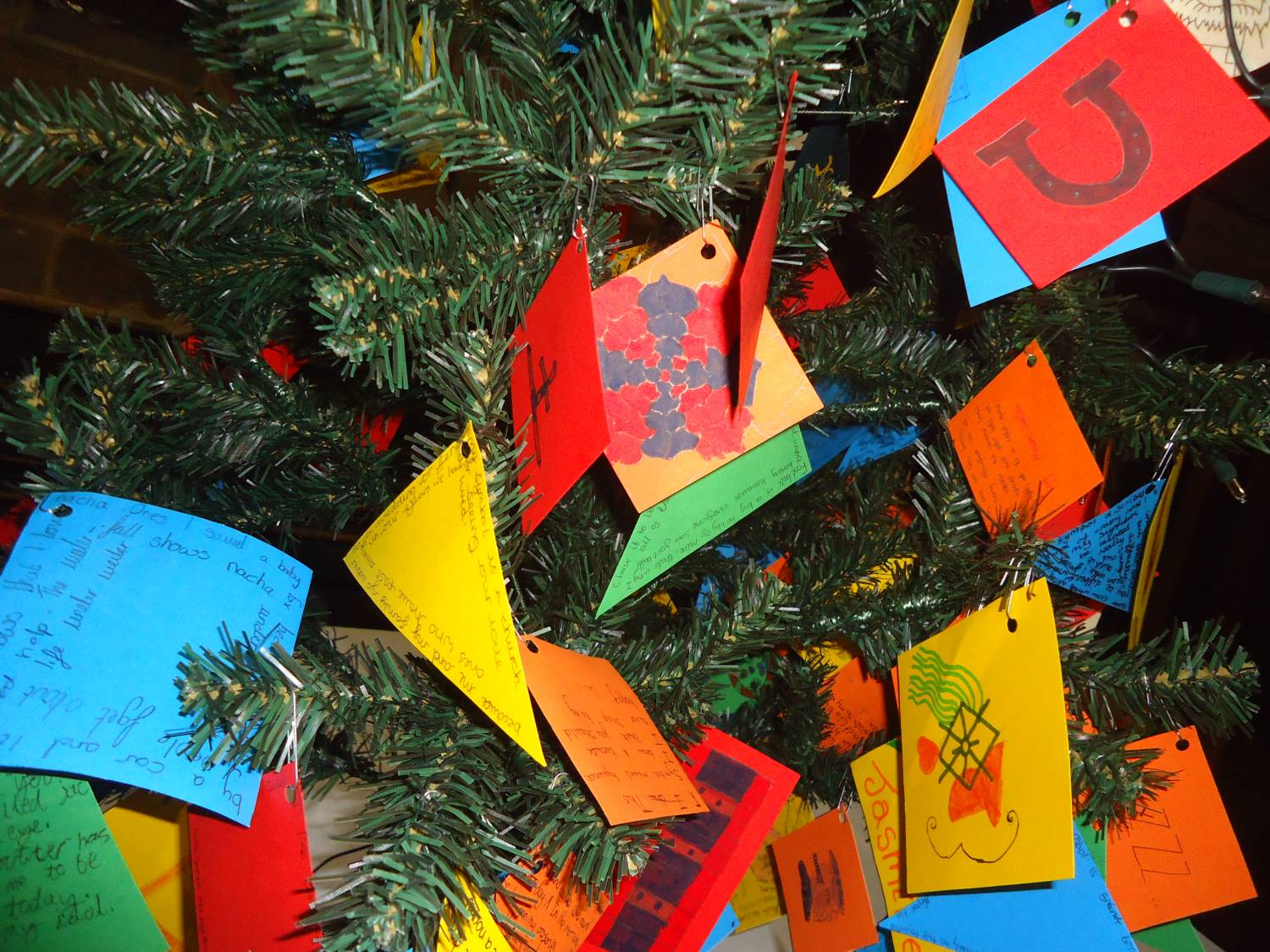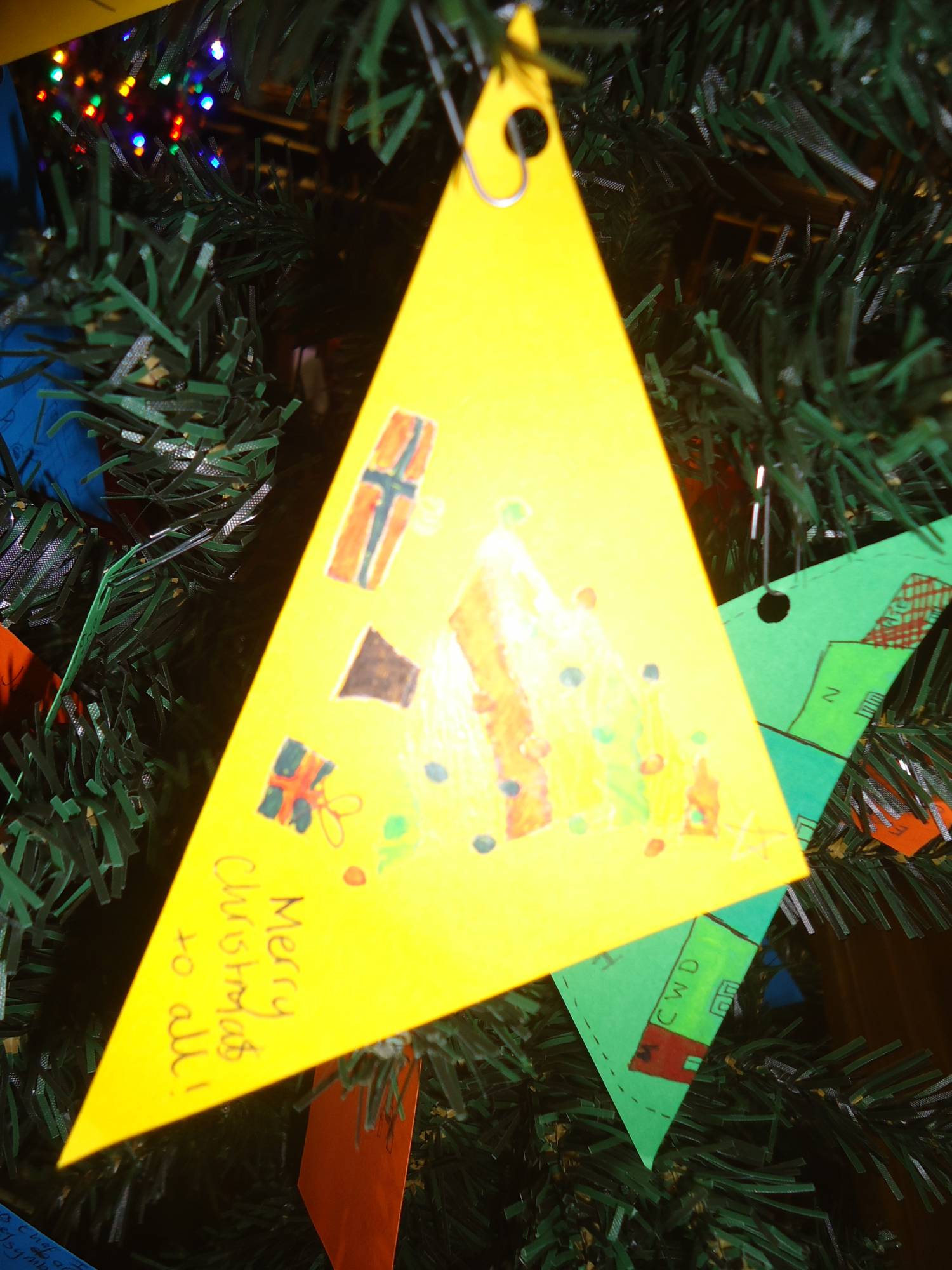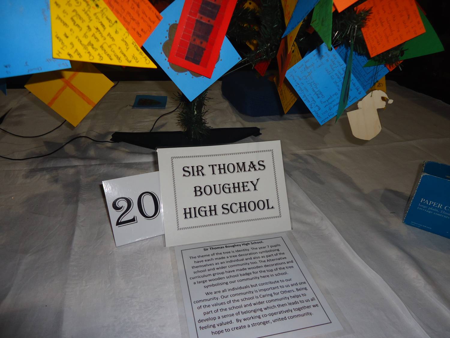 We have a tree decorated by our year 7 pupils and the year 11 Alternative Curriculum group. The theme of the tree is identity. The year 7 pupils have each made a tree decoration symbolising themselves as an individual and also as part of the school and wider community too. The Alternative curriculum group have made wooden decorations and a large wooden school badge for the top of the tree symbolising our community here in school.