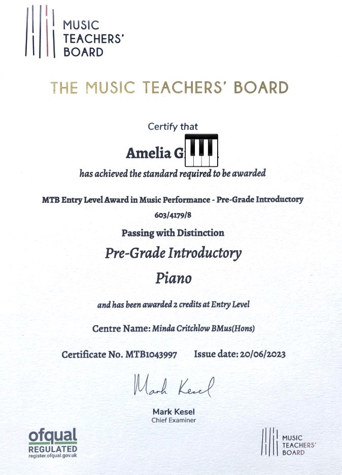 - Amelia – DISTINCTION in her first piano exam