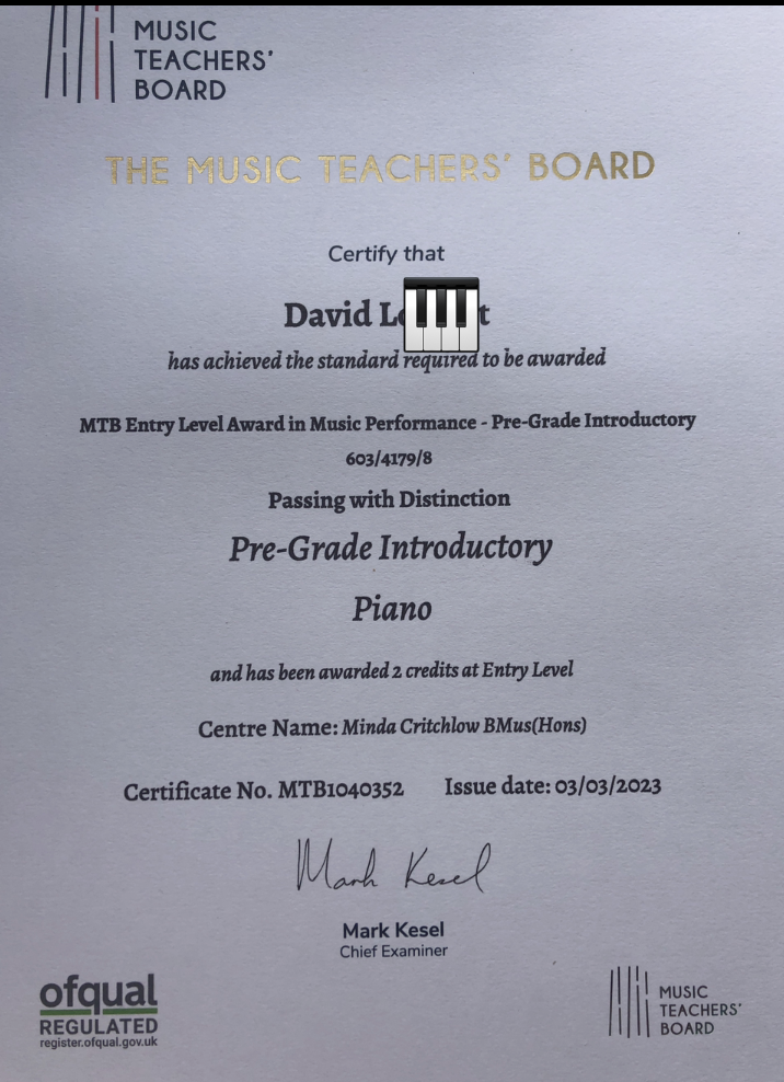 - David – Pre Grade Piano – Distinction