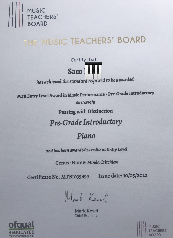 - Sam: Pre-Grade Piano – Distinction