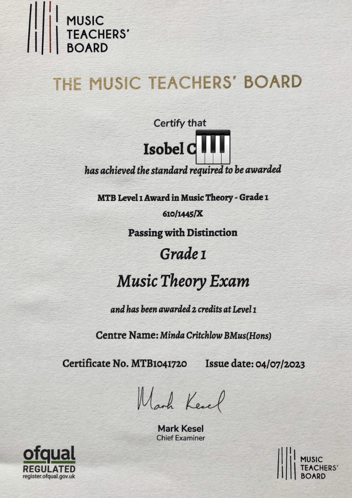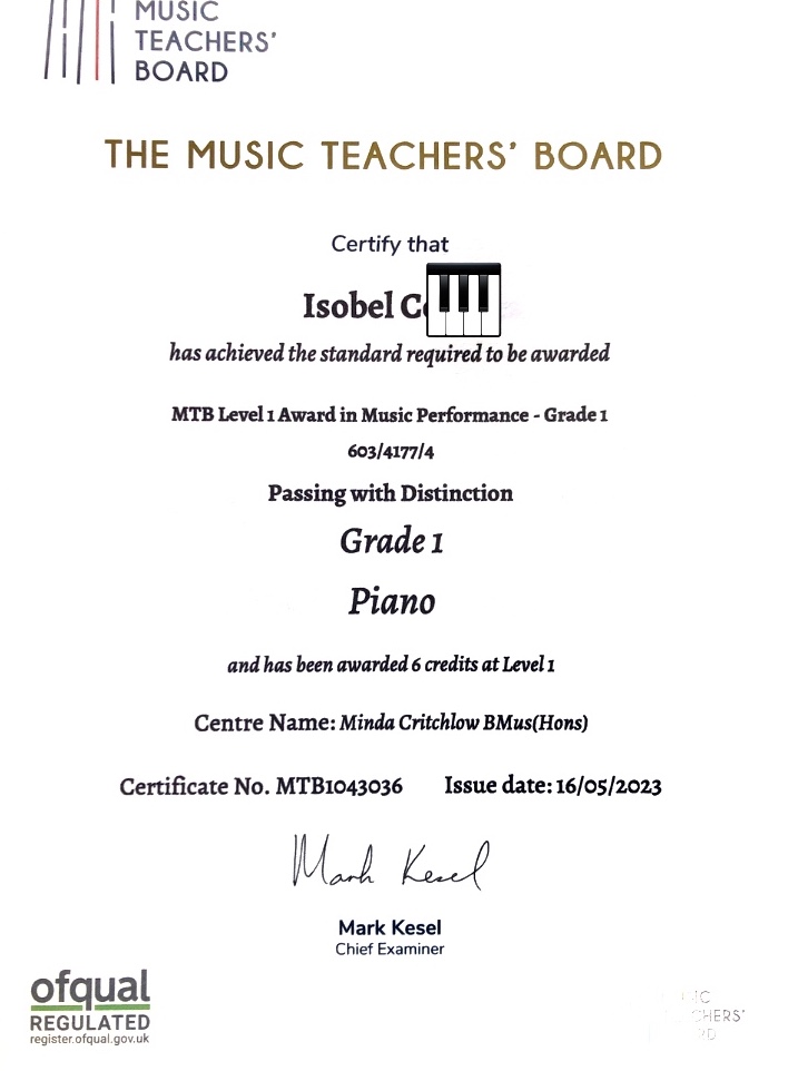 - Isobel – DISTINCTION in your Grade 1 Piano examination