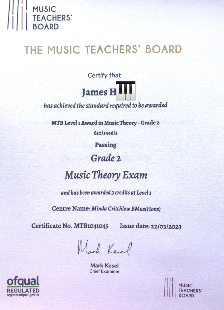 - James – Grade 2 Music Theory – Pass