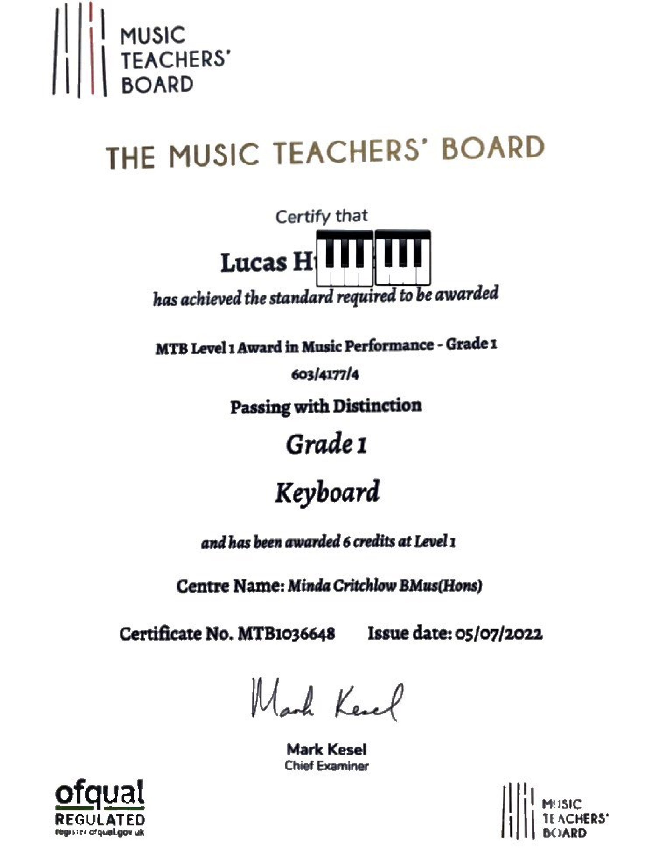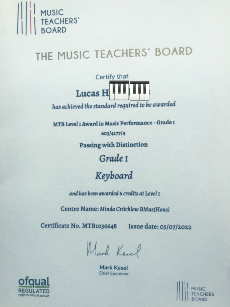 - Lucas: Grade 1 Keyboard – Distinction
