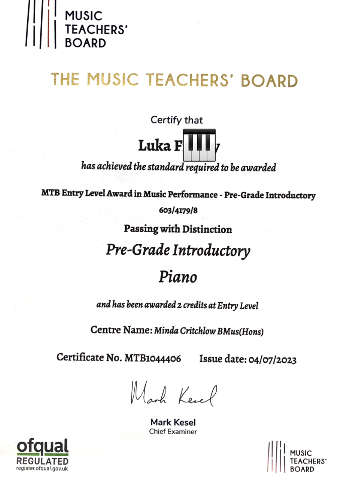 - Luka in Year 8 who has achieved an amazing DISTINCTION in his first piano exam. Luka, you have worked so hard to achieve this fantastic result and you should be very proud. Well done.