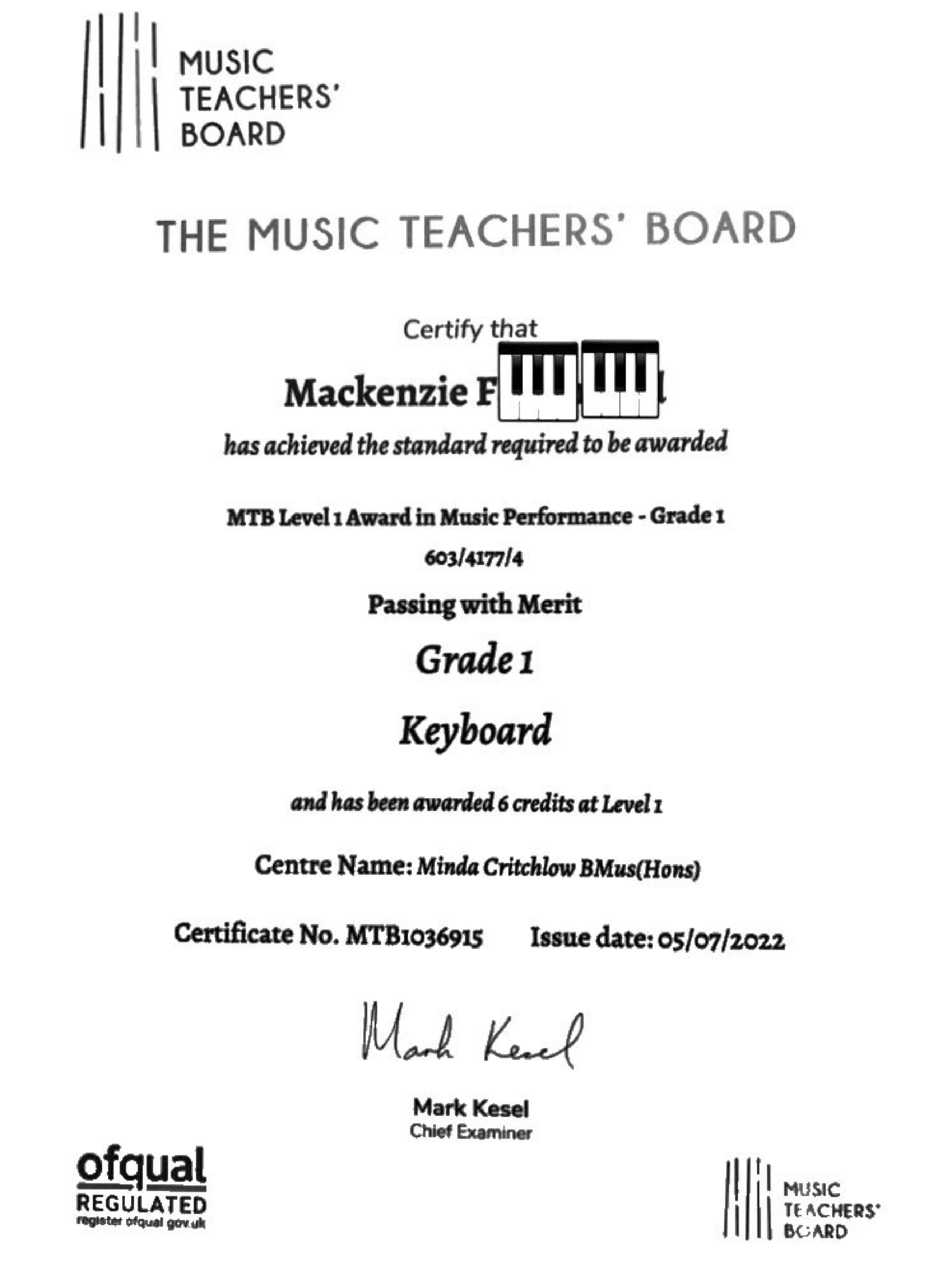 - Mackenzie: Grade 1 Keyboard – Merit