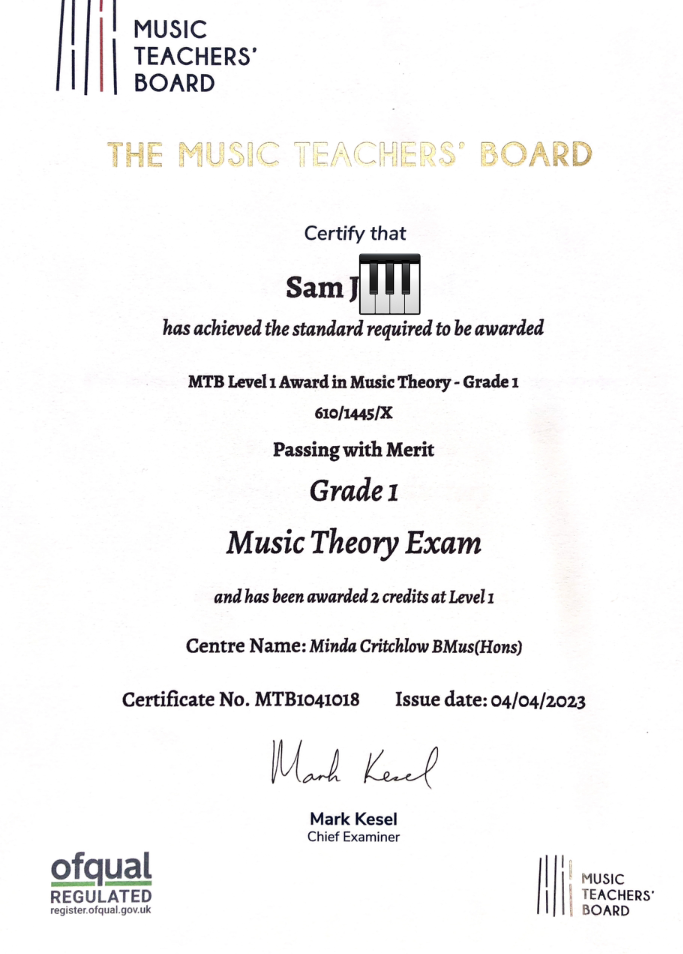 - Sam – High MERIT in your GRADE 1 MUSIC THEORY EXAM.
